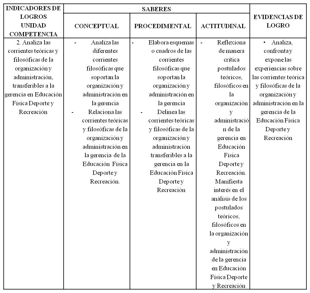 Asocia de forma analítica, las diferentes teorías administrativas y de la práctica gerencial que orienta el pensamiento de la institución, transferible a la organización y administración de la Educación Física, Deporte y Recreación para el abordaje de situaciones en el campo gerencial de esta área en estudio.